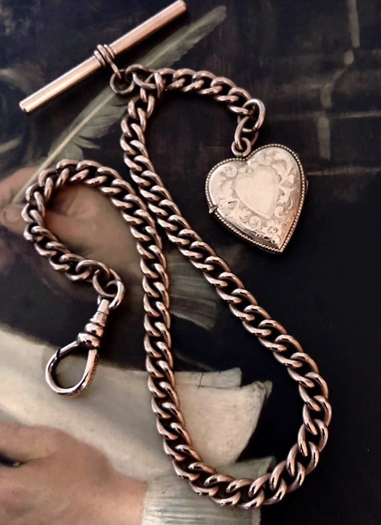 英国アンティーク R.GOLD ローズゴールド アルバートチェーン ハート型 ロケットフォブ 草花模様 両面装飾 懐中時計25,5g ビクトリア期1890年代 アンティークファッション