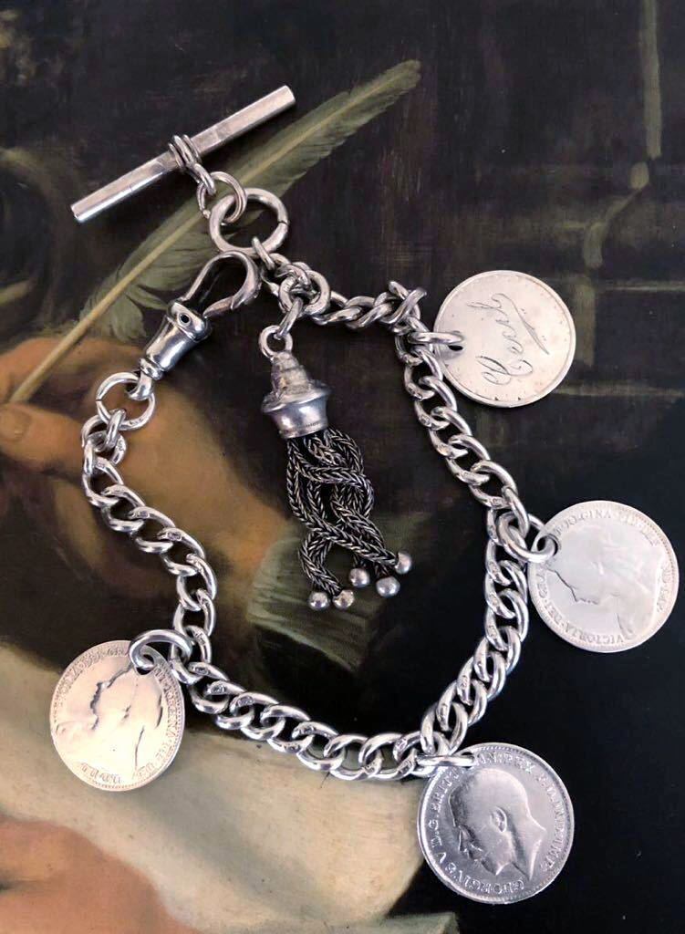 英国アンティーク タッセルフォブ アルバティーナ コイン/銀貨 懐中時計 チェーン ブレスレット 純銀21.6g エドワード期1910年 HP社製 アンティークファッション Britishmade