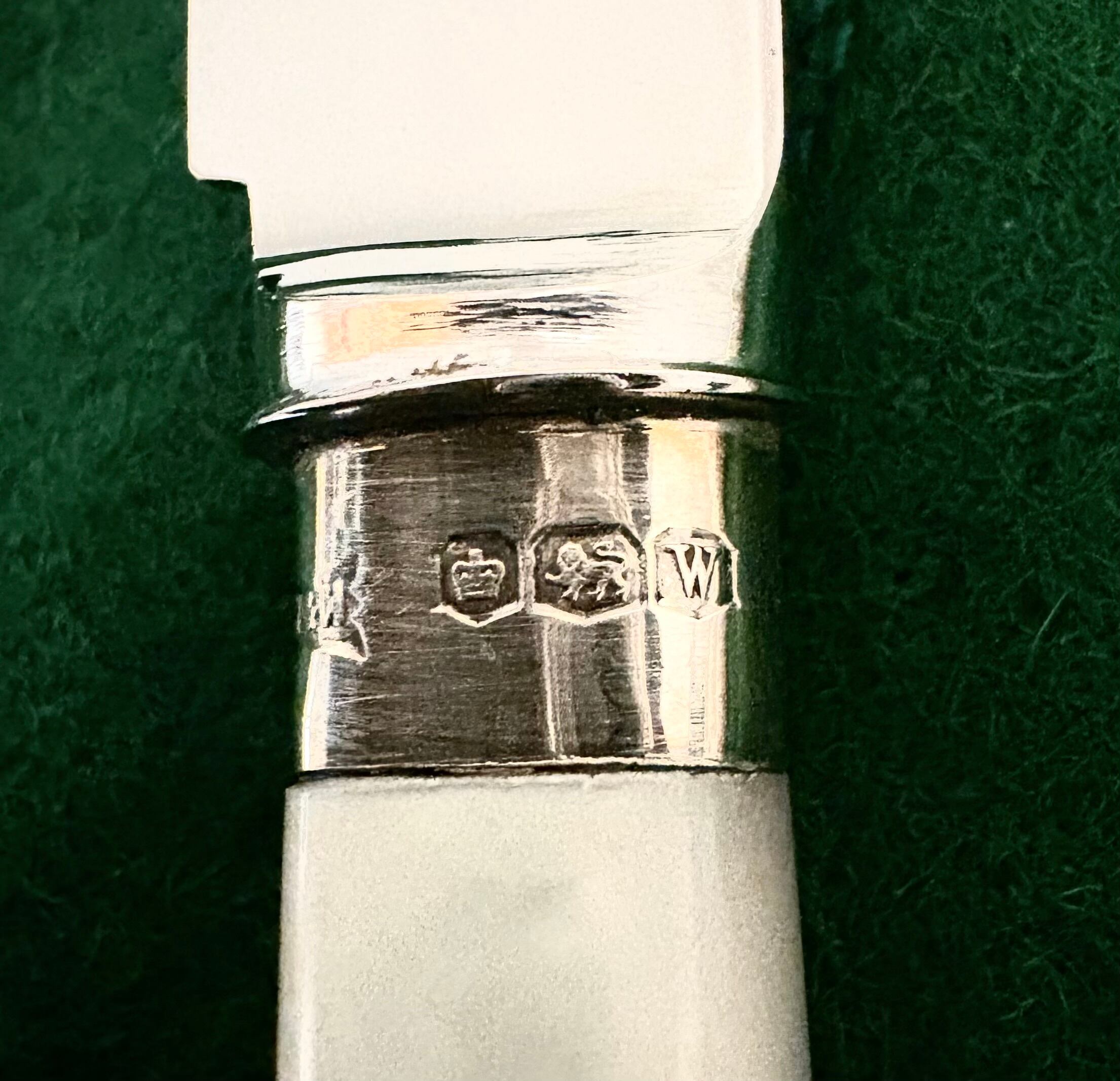 英国アンティーク 白蝶貝 純銀&ステンレス フルーツナイフ&フォーク カトラリーセット 12本/6人用 1939年 シェフィールド WH社布袋付 WALKER AND HALL ウォーカーホール 英国王室御用達