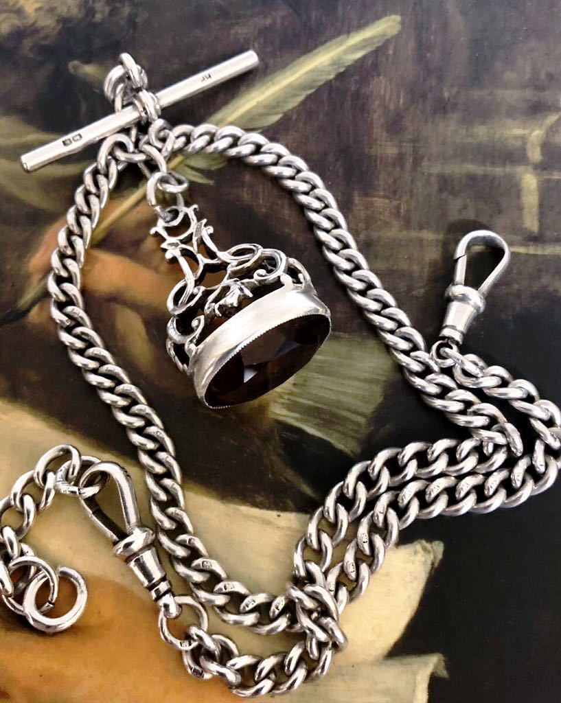 英国アンティーク シトリン石付フォブ ダブル アルバートチェーン シルバー 純銀42g 懐中時計 ジョージ5世 1918年 Henry Pope社製 ペンダント ネックレス ウオッチチェーン コレクターズ アンティークジュエリー Britishmade