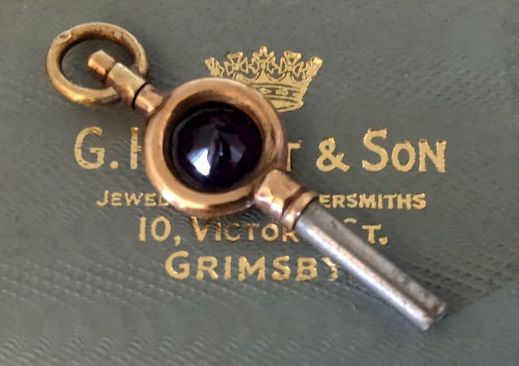 英国アンティーク アメジスト石付 ブリリアントカット 鍵/鍵巻 キーフォブ/チャーム 大サイズ 懐中時計 ウオッチキー アルバートチェーン ビクトリアン・アンティークジュエリー コレクターズ