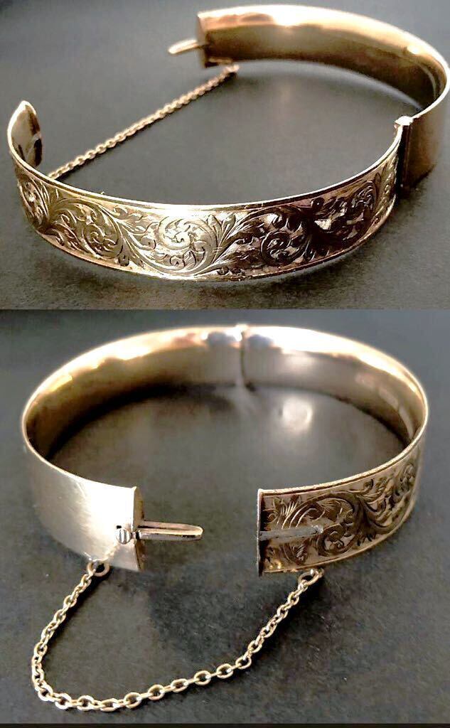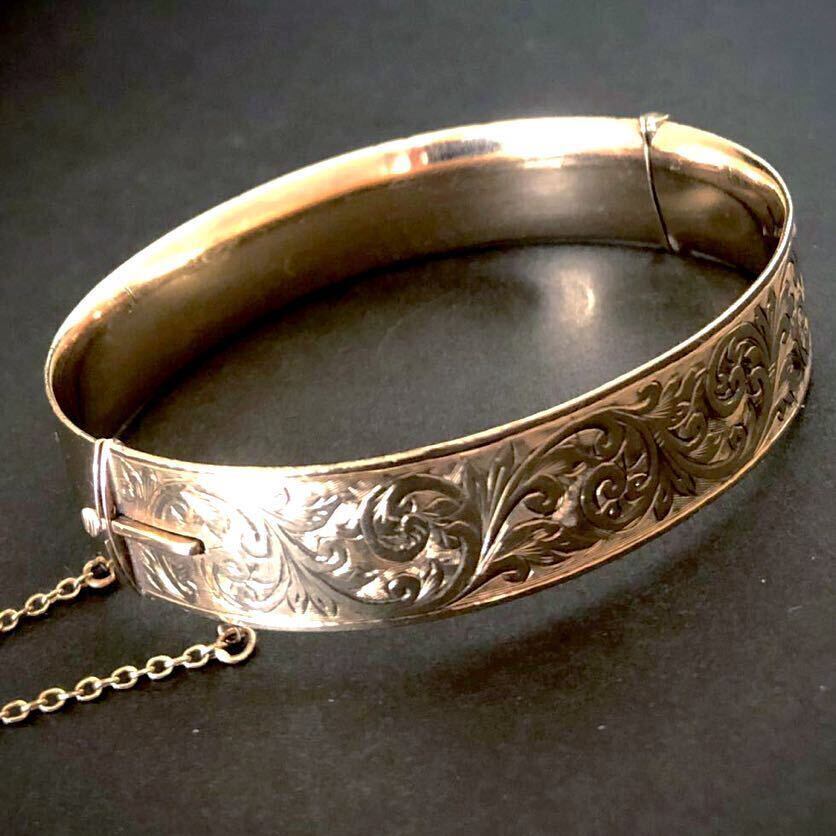 英国ビンテージ 9CT R.GOLD ロールドゴールド バングル ブレスレット 唐草模様 セーフティーチェーン 31g/17.3cm L.W&G LAGARMIC 社製 ビンテージアクセサリー