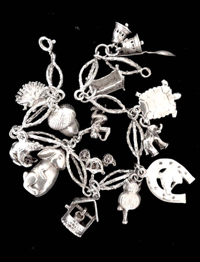 英国ビンテージ チャーム 馬蹄/どんぐり/馬車/ハリネズミ/アンティークベル/アニマル 14個 ロンドン1964年 純銀26.6g シルバーチャームブレスレット ビンテージアクセサリー Britishmade